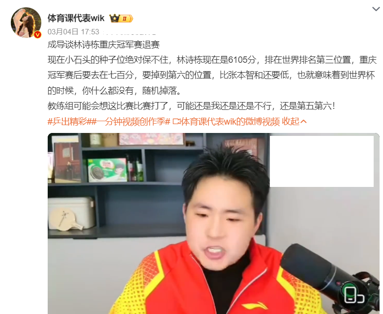 解说员成导谈林诗栋退出重庆冠军赛,他认为林诗栋的种子位肯定保不住,他现在是6105分排在世界第三,重庆冠军赛丢700分,他的世界排名会掉到张本智和的后面,也意味着到世界杯什么都没有。教练组可能已经想到了,林诗栋就算打重庆站可能还是不行,最后还是掉第五、第六,不如让他休息调整。
